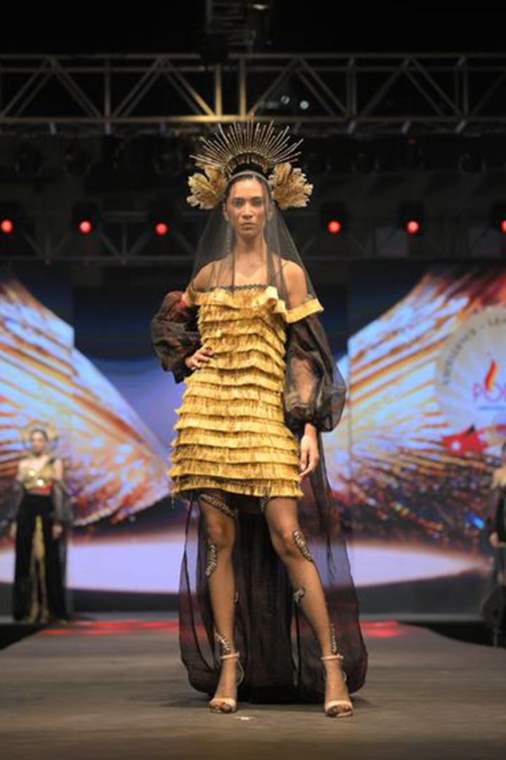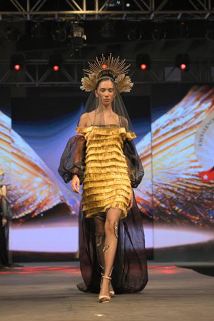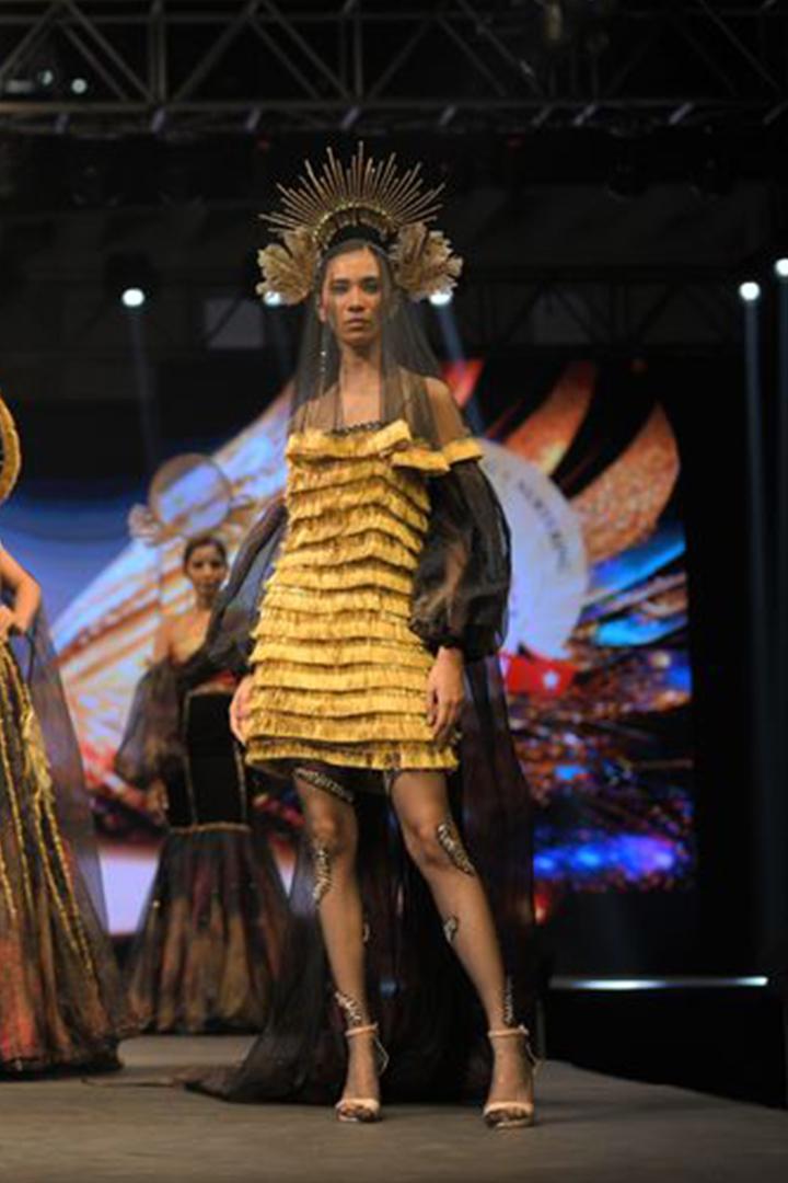 An avant-garde one-piece offshoulder dress with puff sleeves, featuring a dramatic long trail adorned with gota lace work, crystal stones, and feathers. Crafted from tie-dye technique fabric, organza, and velvet, this design draws inspiration from the phoenix bird, symbolizing fiery rebirth and ethereal elegance