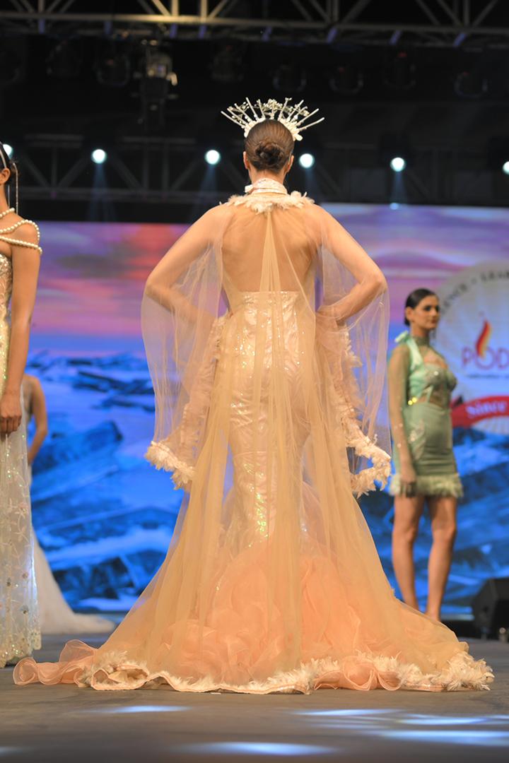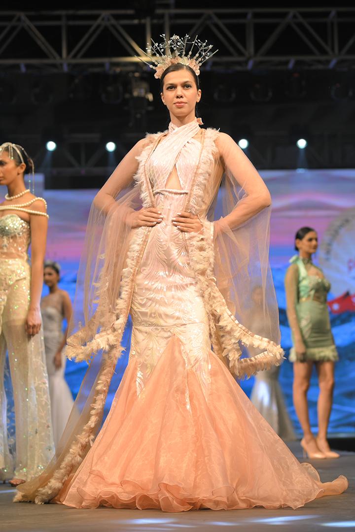 Design : a long ground touch gown with halter neck and organza goddess with a long bell sleeves shrug with fur adges