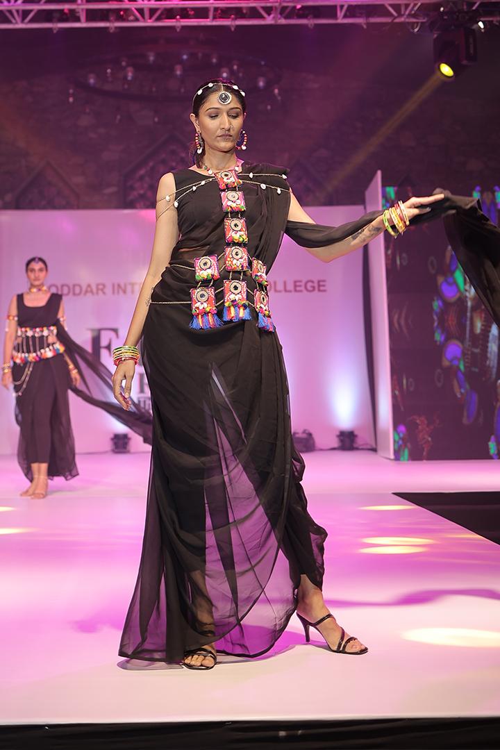 A black pre draped dhoti style sareepaired with a vibrant Banjara belt, creating a chic bohemian look with afusion of tradition and style.