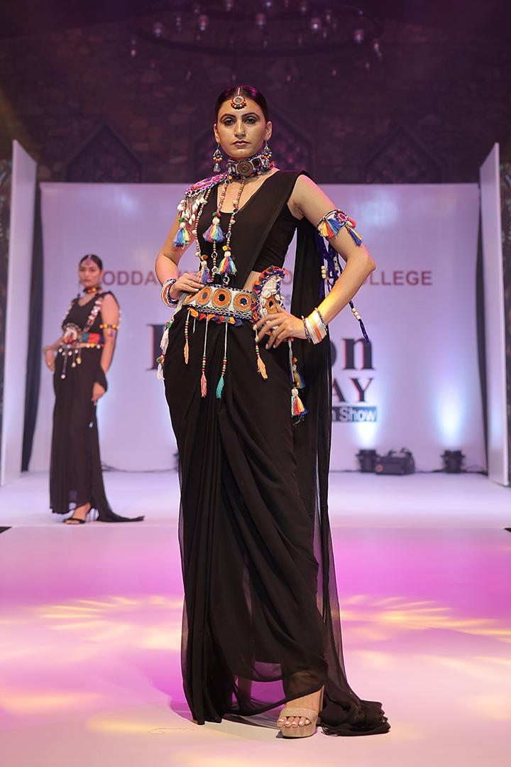 A black pre draped dhoti style sareepaired with a vibrant Banjara belt, creating a chic bohemian look with afusion of tradition and style.