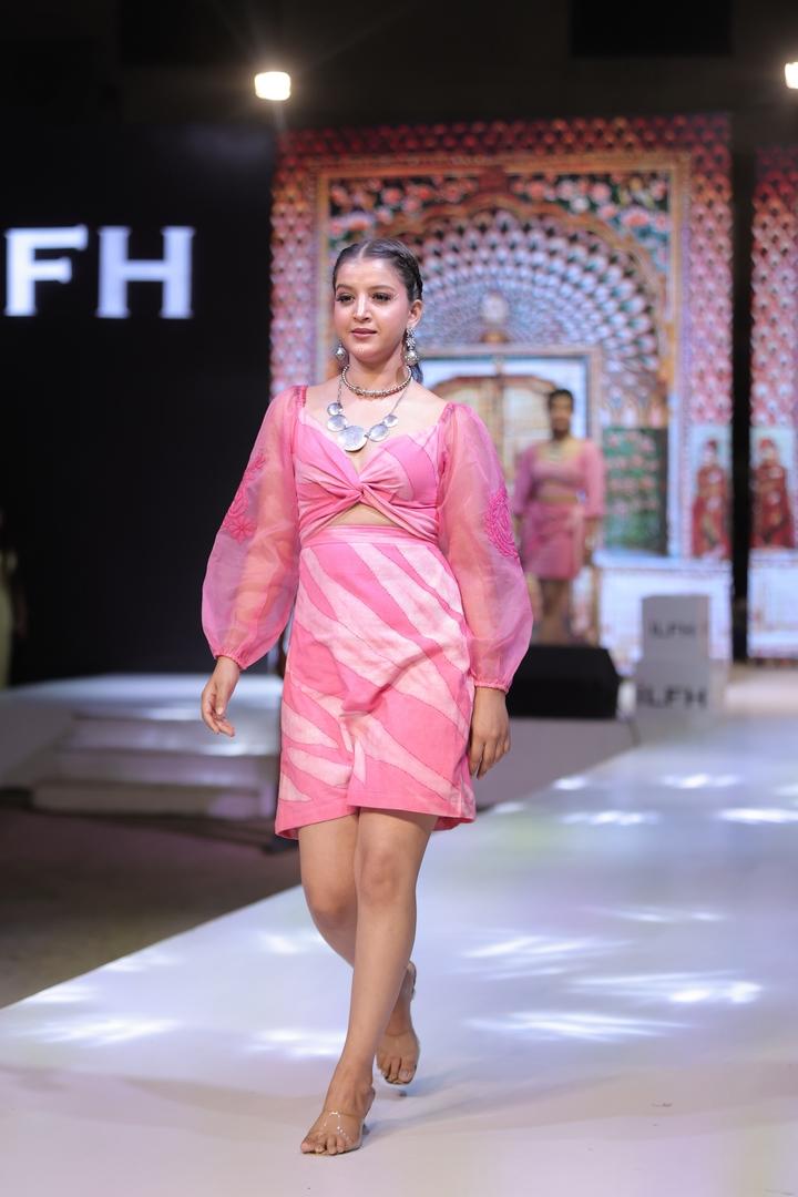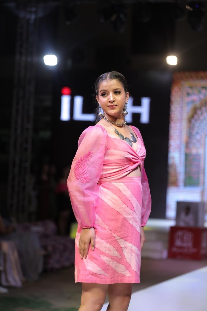 Skirt Design: High-waisted, knee-length skirt showcasing a unique Batik dye pattern in pink and white.
