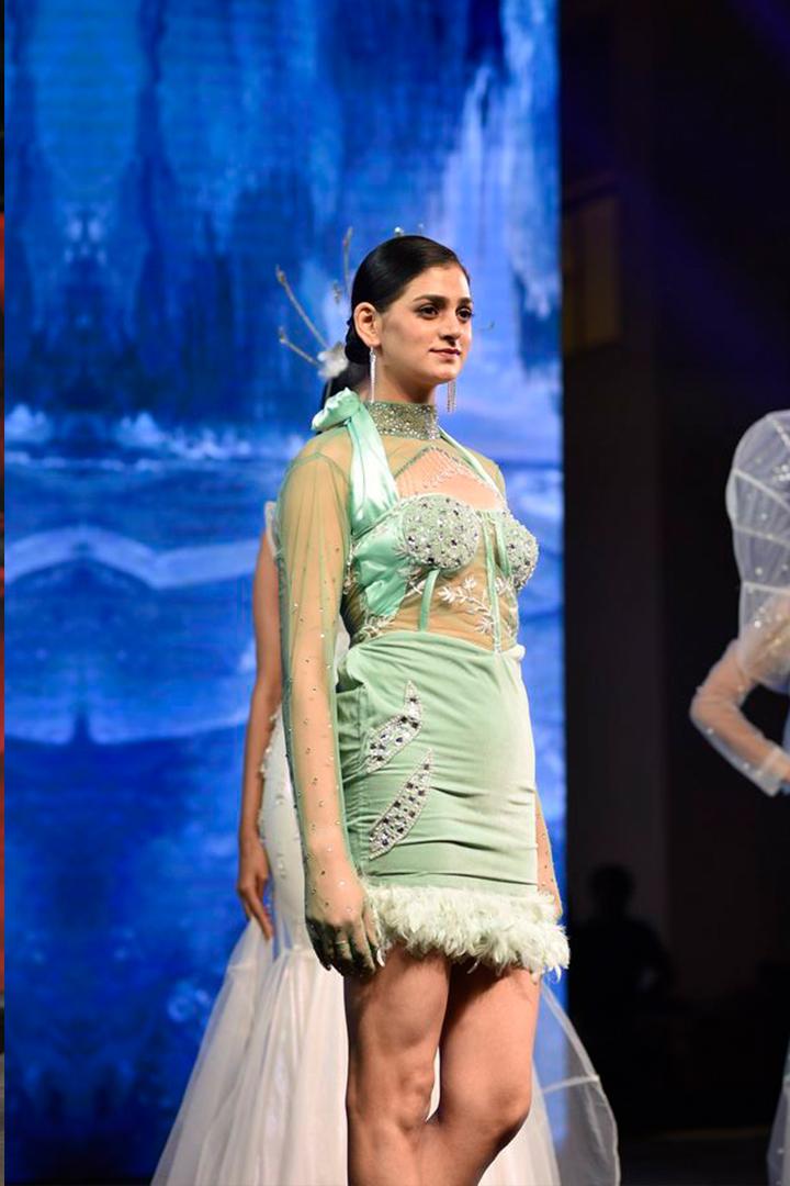 Design : a corset mini dress with high-neck long gloves