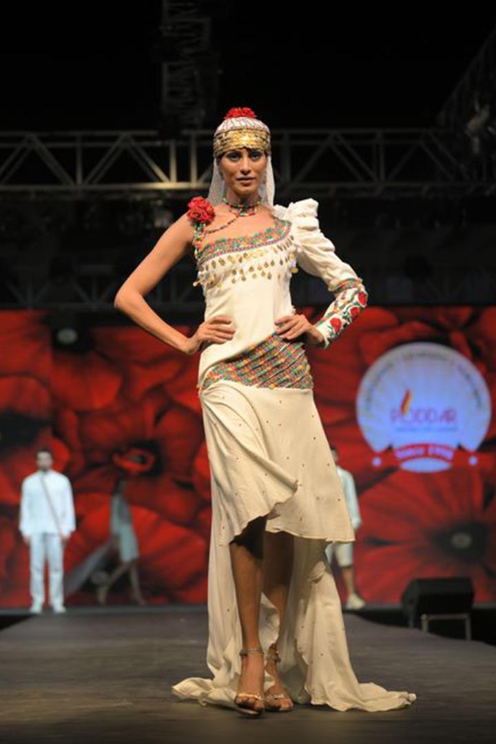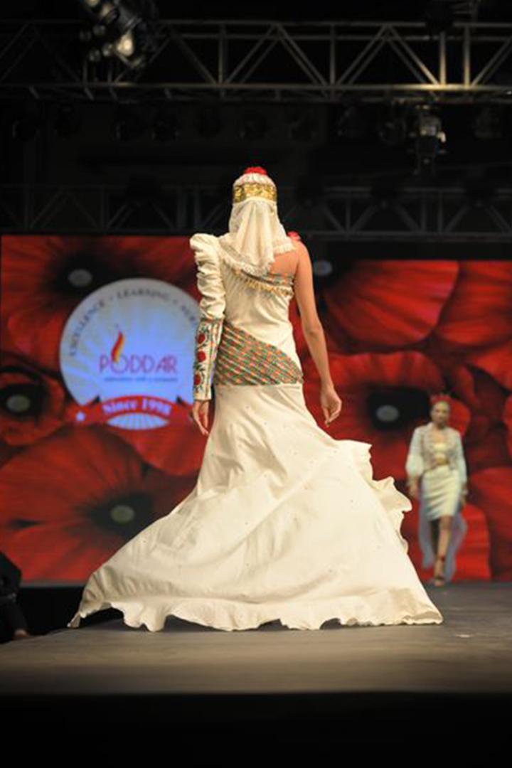 Design : One-shoulder puff sleeve dress featuring a floor-length trail with intricate details.